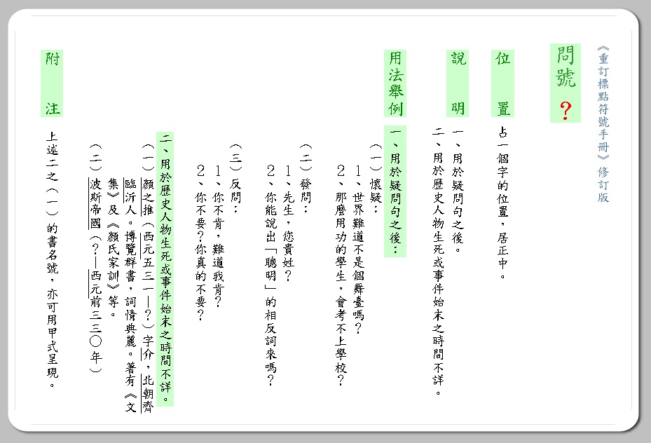 (一)懷疑: 1、世界難道不是個舞臺嗎? 2、那麼用功的學生,會考不上學校? (二)發問: 1、先生,您貴姓? 2、你能說出「聰明」的相反詞來嗎? (三)反問: 1、你不肯,難道我肯? 2、你不要?你真的不要? 二、用於歷史人物生死或事件始末之時間不詳。