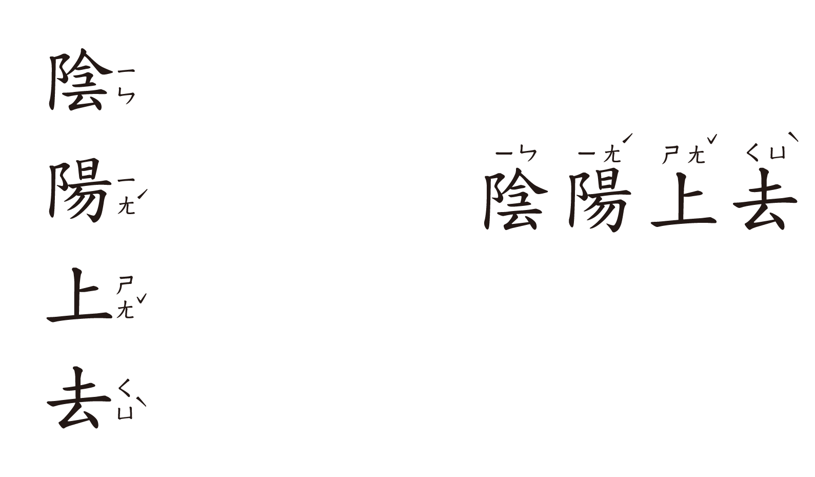 聲調標注示例: 一、 陰陽上去四聲調號,無論直式或橫式,標注在字音最後一個符號右上角。