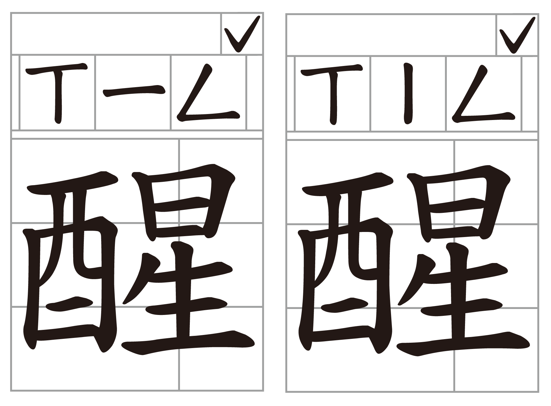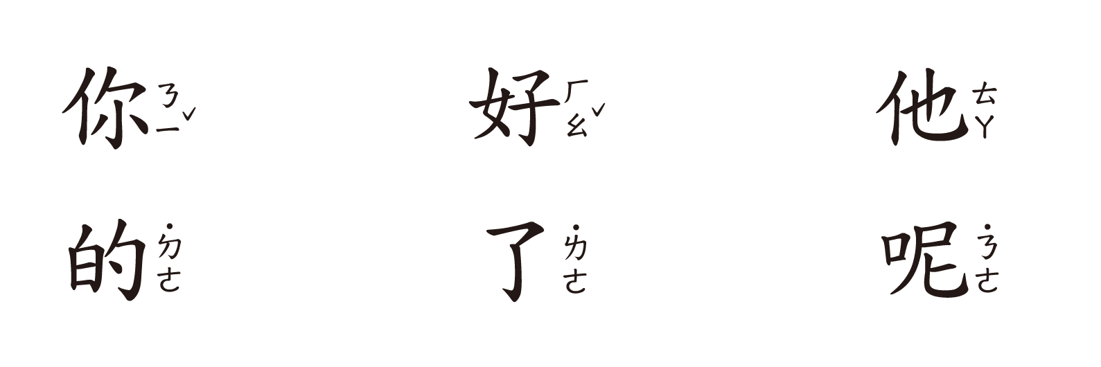 本手冊所提供之「國字注音比例參考圖」及「國字注音示例」皆附有直式、橫式兩種注音符號標注方式。