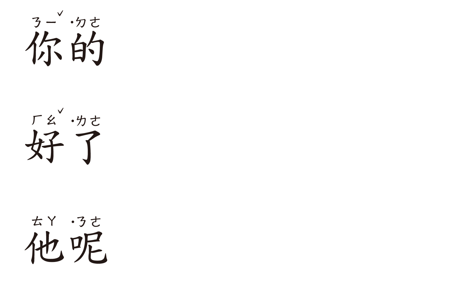 以圓點代表較輕短之變調。 | 直式注音時標注在字音上方,橫式注音時標注在字音前方。 |