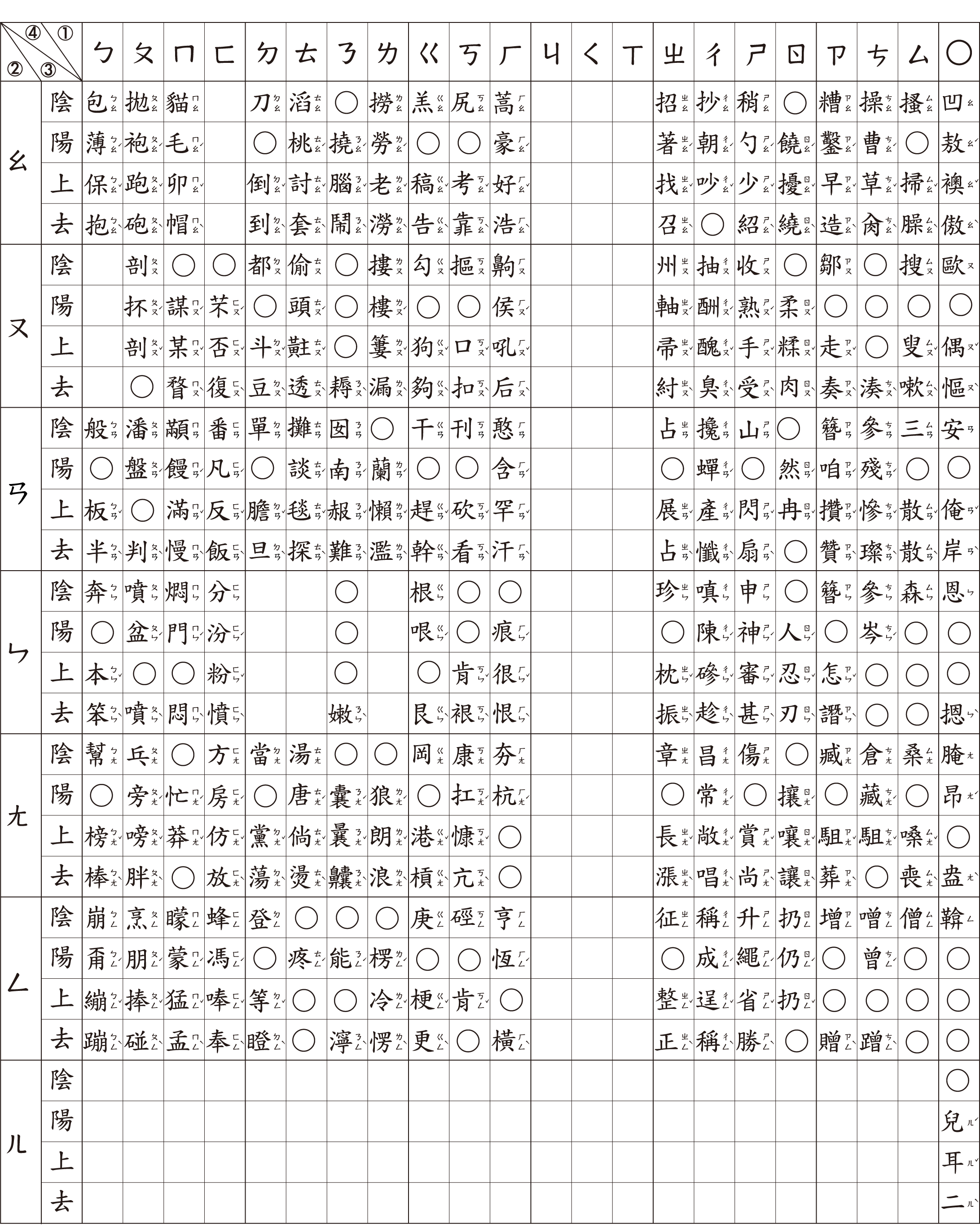 「國語注音符號體式表」中之總表列舉全部注音符號之體式(聲符「