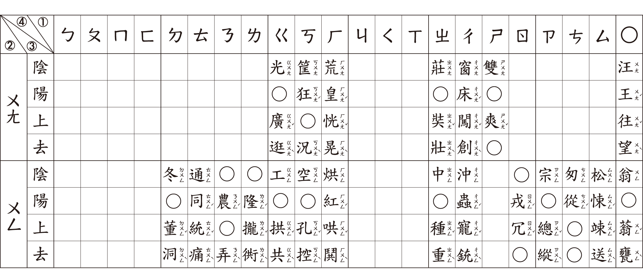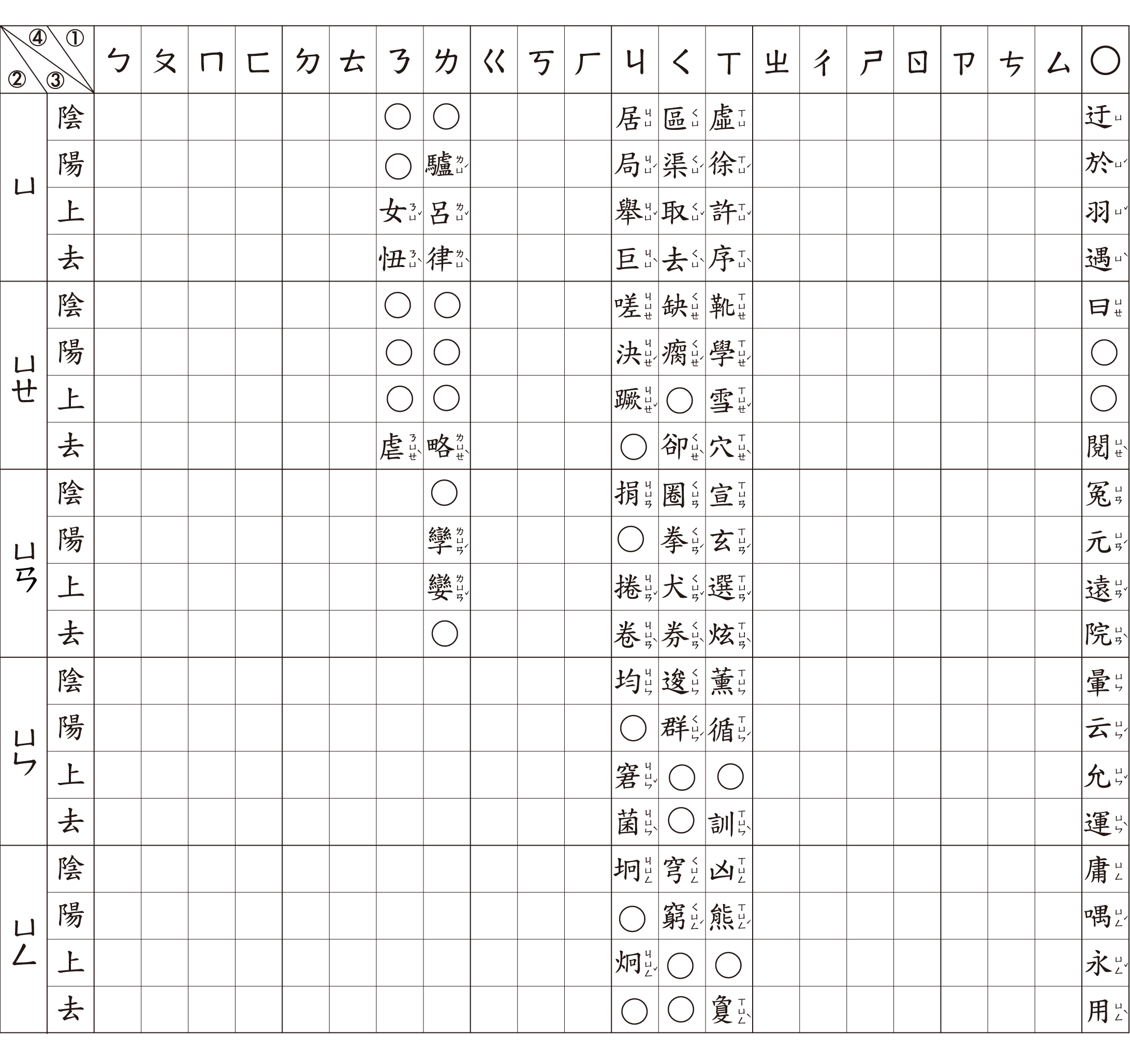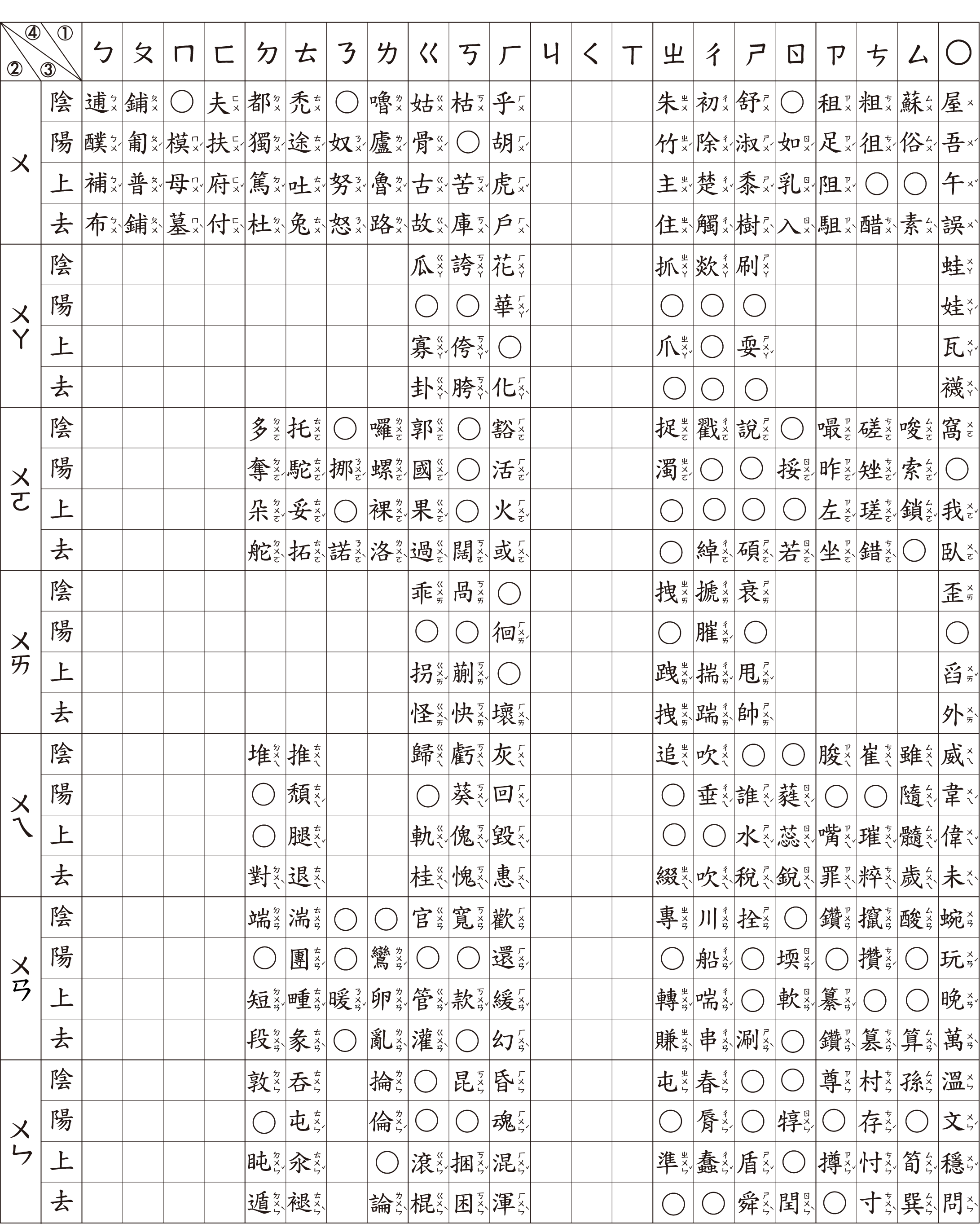 ①聲符②韻符③四聲④例字。〔 〕內輕聲變韻字寄此。
